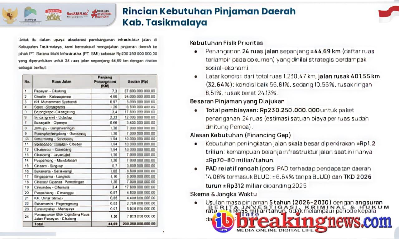 Beritainfobreakinngnews.com – Tasikmalaya, Jawa Barat,- Harapan Pemerintah Kabupaten Tasikmalaya untuk mempercepat pembangunan infrastruktur jalan melalui skema pinjaman daerah senilai Rp 230,25 miliar resmi kandas. Dewan Perwakilan Rakyat Daerah (DPRD) menolak pengajuan tersebut dalam rapat paripurna yang berlangsung dinamis, menggugurkan 24 proyek strategis yang telah dirancang Dinas Pekerjaan Umum dan Penataan Ruang (PUPR).